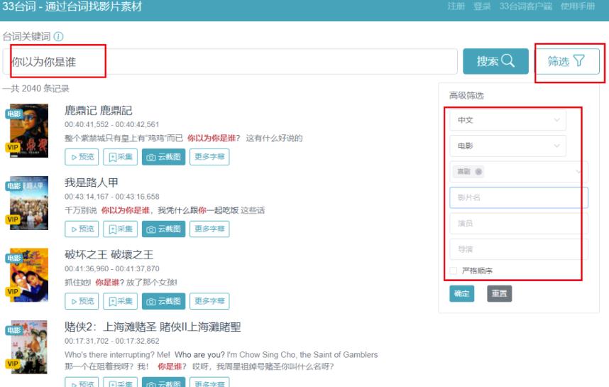 而且还非常明确的标注了台词出现在什么时间段,直接把这个片段剪出来用就可以了,而且这两个工具还自带筛选语言和类型的功能,非常好用。